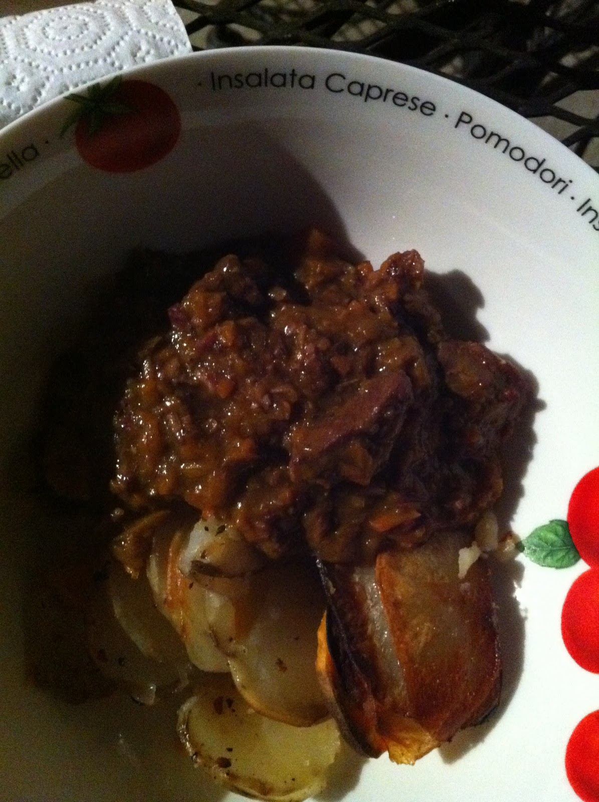 This meal was fantastic and is now firmly established as one of my favorites. The stew was so flavorful (thanks to the fine piece of meat and the entire bottle of wine) and proved to be the epitome of comfort food. The potatoes were crispy yet soft and had a delightful melt-in-your-mouth quality with just a hint of thyme. It was relatively easy to make, but took about 4 hours total (1 hour prep and assembly; 3 hours simmering with the occasional stir).
