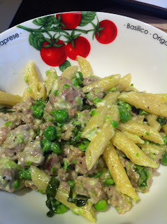Italian Sausage, sweet peas, and mascarpone pasta. Boom goes the dynamite.