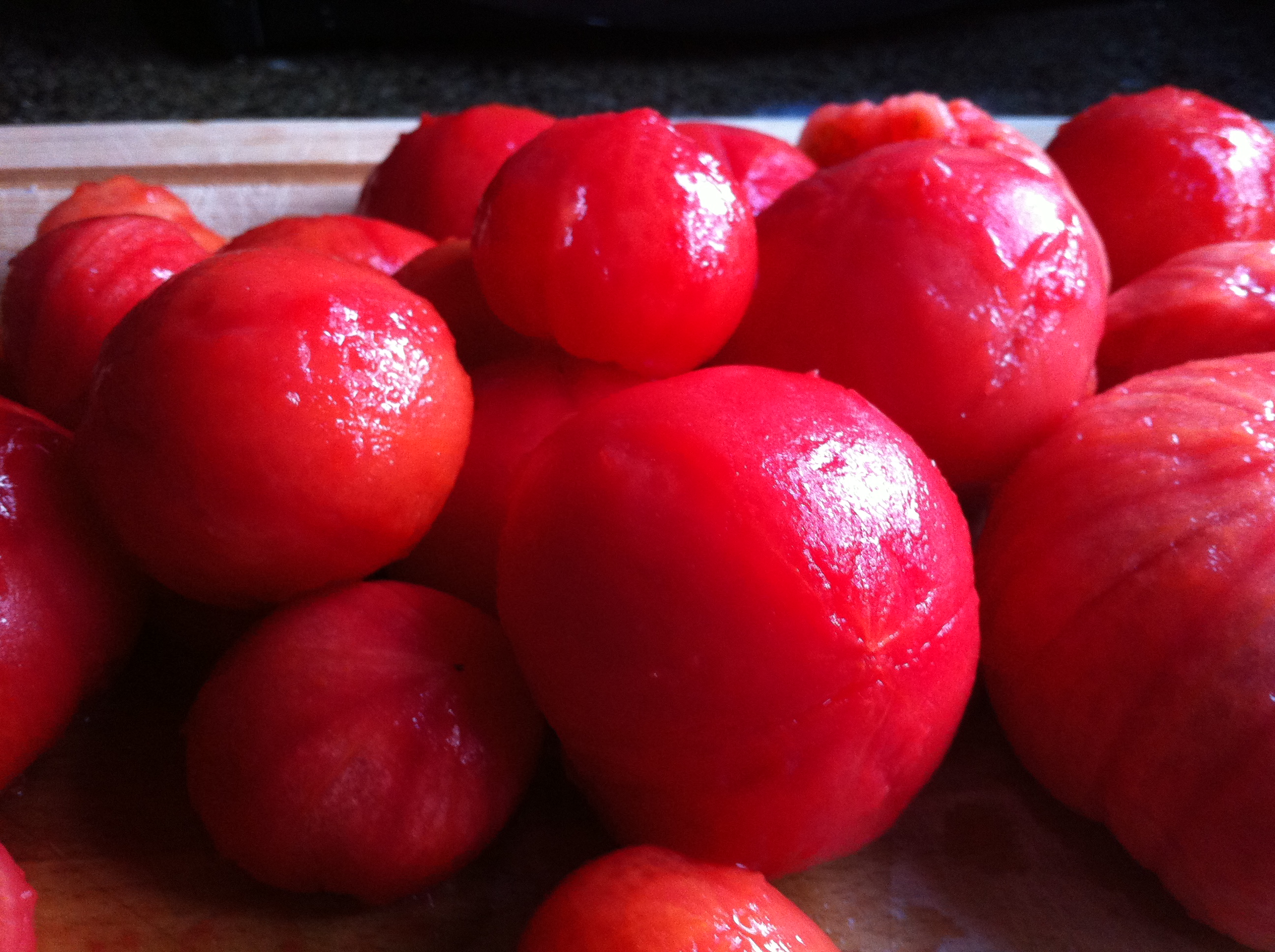 Start with the tomato sauce and blanch the tomatoes. You don’t have to do this part, but it does make a smoother sauce in the end. Dunk the tomatoes in boiling water for 15 seconds and then peel them. It’s a good idea to core and score them first, so that you aren’t handling a slightly mushy product post-blanch. Chop them coarsely or put through the food processor. You will puree the whole thing later, so processing them now is not essential!