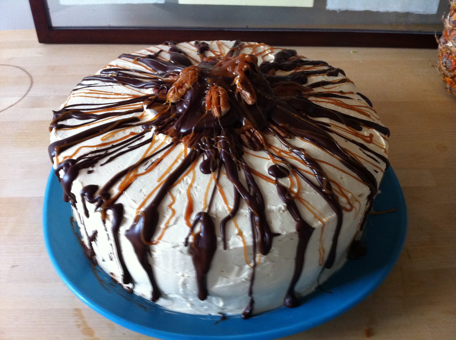 chocolate turtles. After some cogitation, I decided on caramel cake and caramel buttercream with a layer of pecans in the middle. The top was then drizzled with chocolate ganache and the leftover caramel sauce I made for the frosting.