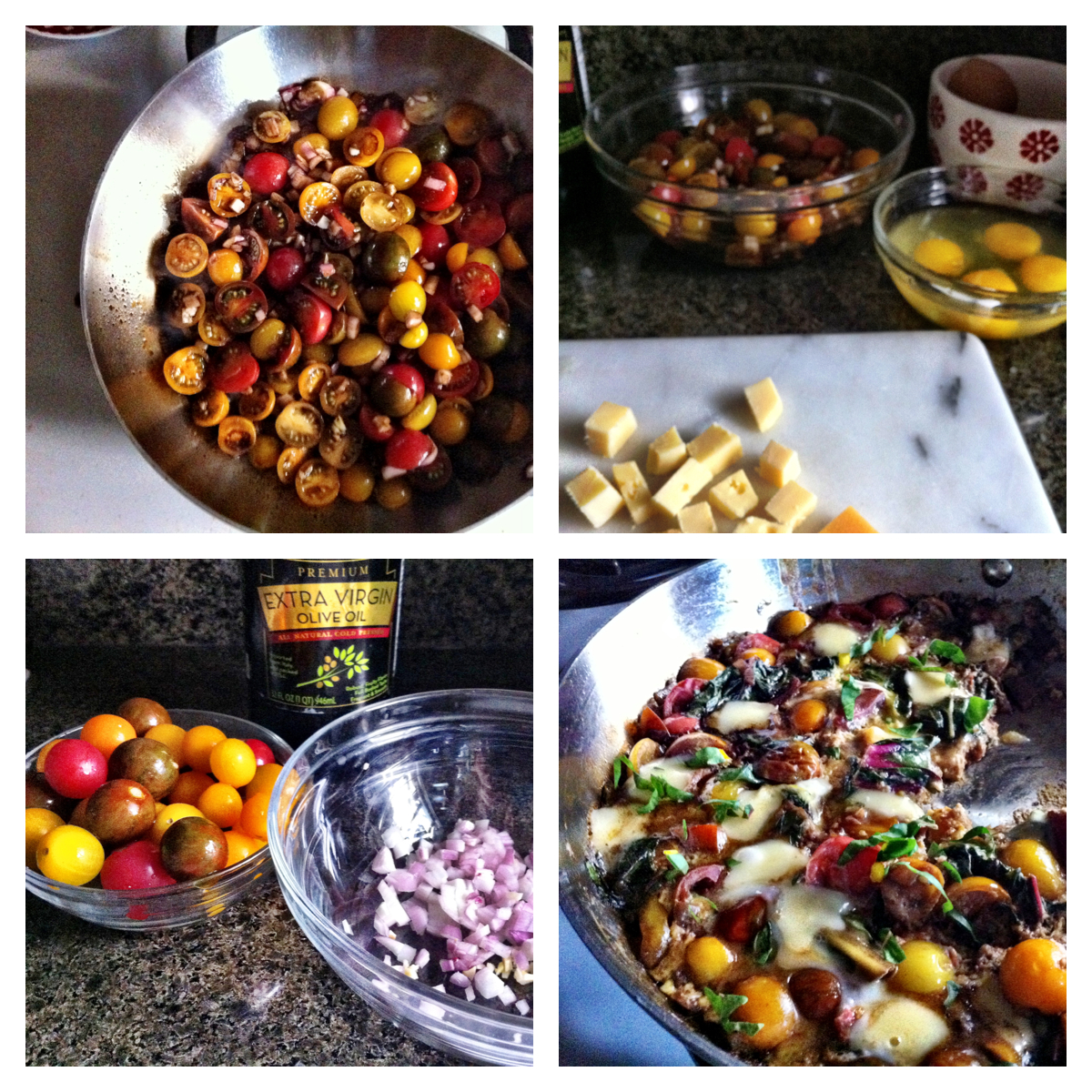 In a large bowl, combine the shallot, garlic, vinegar, salt, and pepper and mix well. Cut the tomatoes in half and add to the bowl. You can use larger tomatoes, but you will need to seed them or else there will be too much liquid in the pan. Toss the mixture and set aside to marinate for up to 1 hour. In a large pan heat the oil over medium-high and add the tomato mixture. Cook for a few minutes and then add the chard, stirring to cover everything with the vinegar. Cook this down for a few minutes, or until the liquid is reduced to a syrup-like consistency. Do not over cook– no longer than 5-7 minutes. Add the beaten eggs and turn heat down to medium-low. Cook for 5 minutes, or until the eggs are mostly set. Sprinkle the cheese over the top and cover for another 5 minutes, or until cooked through. Remove from heat, sprinkle with the basil, and serve immediately. Great with garlic toast!