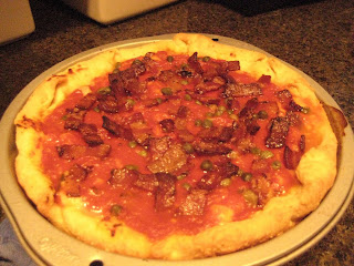 Deep Dish Bacon and Caper Pizza.